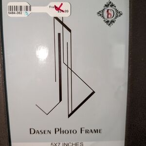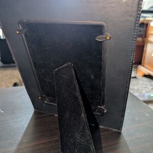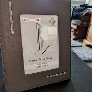 The frame is designed for 5x7 inch photos (13cm x 18cm). It features decorative embellishments, with small, rectangular, white or silver-colored accents along the left side and bottom edge of the frame. The frame appears to be new, as a tag is still visible inside the frame's opening. The material of the cover is described as leather, giving it a classic and elegant look. Total of 2 available