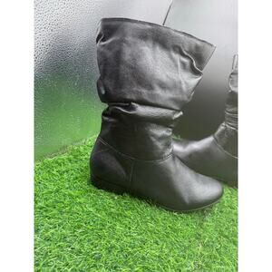 Faux Leather - Black -Slouch Boots-Size 10W. These black faux leather mid-calf slouch boots have a soft, relaxed look that pairs effortlessly with jeans, dresses, or leggings. They give that comfy-chic vibe without trying too hard. Excellent condition, never worn, clean and ready to style!! Great value!!