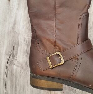 Faux Leather Brown Moto Buckle Riding Boots Size 6 Tall Biker Western Cowboy