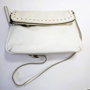 This Faux Leather Crossbody bag can be used both as a shoulder bag and folded to be used as a clutch. It features a foldable strap that can be tucked inside the bag, Zippered pockets on each side and zippered opening, The studs and the tasseled zipper that accent the top of the outside of the bag give it an extra flair. Perfect for work, shopping, travel. Preowned. No Flaws. Very Good Condition.