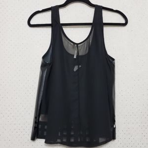 Super cute black faux leather tank with cutouts along the front bottom and a semi sheer, black chiffon back.