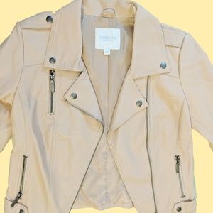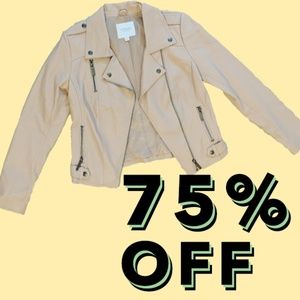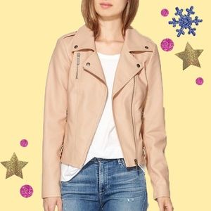 This vegan leather jacket is SO SOFT! Both in touch, and in color. The light peachy-ish pink is very neutral and matches back to a lot of different pieces. Detailed with very high-quality and high-functioning moto touches, like the side snaps that allow you to cinch the waist a bit for a slimming look and arm zippers that look appealing as well as allow for some extra arm room.