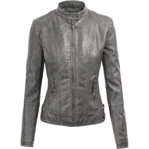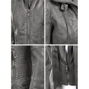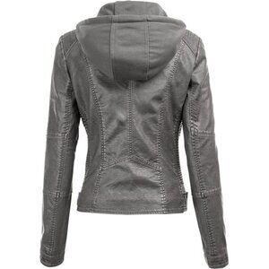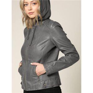 Faux leather jacket featuring a removal knit hood and front panel with exposed zipper