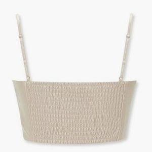 Cropped cami with a sweetheart neckline, adjustable straps, button front, and smocked back panel, as well as a pair of high-rise shorts with a cuffed hem, zip fly, and button closure.