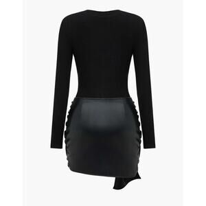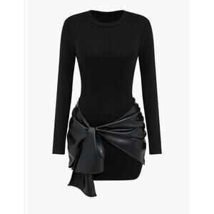 Faux Leather Patchwork Tie Front Round Neck Ruched Mini Dress