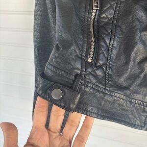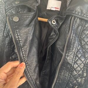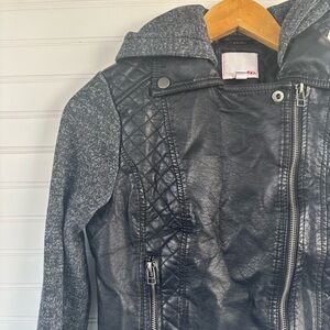 Stylish faux leather jacket with quilted details. Features a cozy hood and zippered pockets. Perfect for layering.