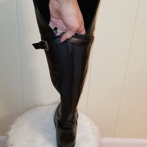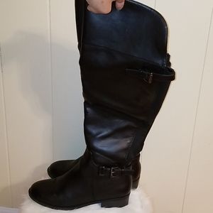Faux leather riding boots. They come just below the knee. Big calf friendly. OK condition