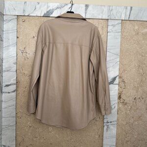 The between-seasons favorite layering piece is a supple shirt-jacket made from buttery faux leather.