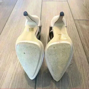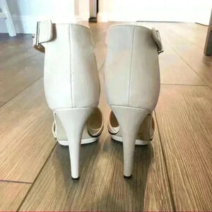 A pair of faux leather pumps featuring a pointed toe, stiletto high heel, ankle strap, open sides, and a tall backshaft.