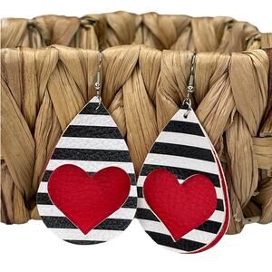 Adorable faux leather teardrop earrings. One pair is a leopard print and the other has two layers, a solid red with a black and white striped with a heart cutout laid on top.