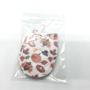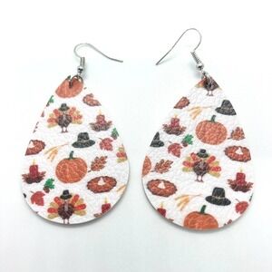 Faux leather teardrop shape earrings. Silver tone hardware. Pattern consists of turkeys, pilgrim hats, wheat, pumpkin pies, colorful leaves, and candles. Pattern is on both sides of the faux leather.