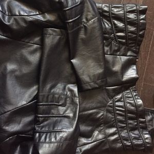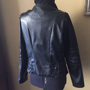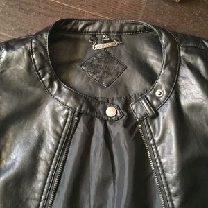Women's black faux leather jacket. Piping detail at elbows and lower waist. Lined, zipper front and snap button at collar.