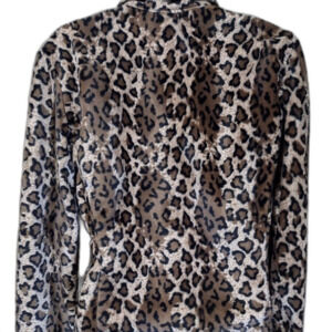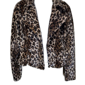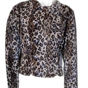 Stella lightweight button-down collared jacket. Tan Brown and Black faux Leopard, clean and ready to wear. The size tag has been cut out and assuming the size of Small to Medium. See measurements below for reference.