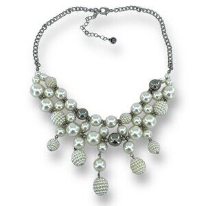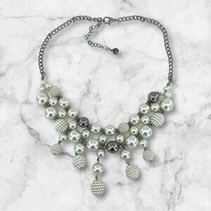 Elegant faux pearl bib style necklace, featuring dangle beads and ball beads on a silver plated chain. Crafted with attention to detail, this piece is a timeless accessory that adds a touch of sophistication to any outfit.