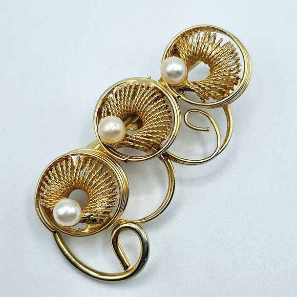Faux Pearl Brooch Wire Circle Swirl Trio Goldtone Vintage Pin