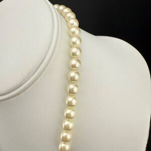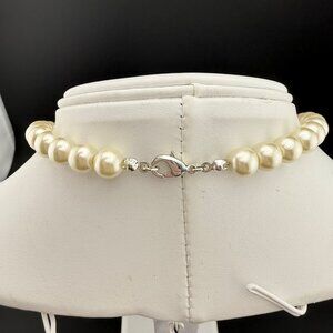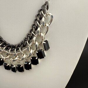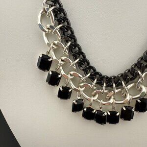 This striking necklace features elegant faux pearls paired with a bold section of silver-tone chains and black square charms. Durable lobster clasp ensures secure wear.