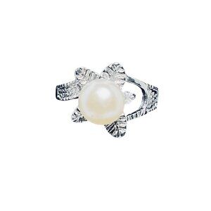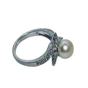 Faux Pearl & Clear Rhinestone Silver Tone Flower Statement Ring Sz 6 (R422)