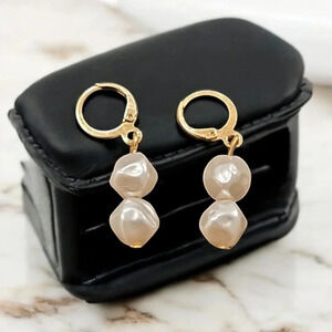 Faux Pearl Gold Plated Clamp Dangle Earrings