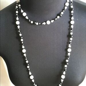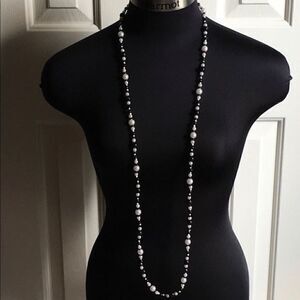 Long faux black & white pearl necklace. Great piece of costume jewelry...can be worn several different ways. Comes with matching earrings.