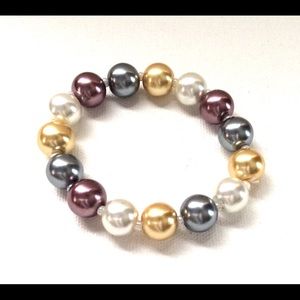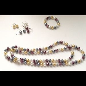 This set is So. pretty! Perfect for the upcoming Spring Season. The pearls have a lush, luxurious look to them. Very hard to photograph...... each piece is absolutely gorgeous! The stretch elastic bracelet slides on & off wrists easily. Earrings are for pierced ears. The necklace measures approximately 50". It is one continuous strand. No clasp. No makers mark. Necklace and bracelet are heavier than they look. Very substantial set. Earrings are lightweight. Comes in pretty box.