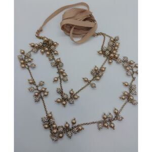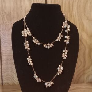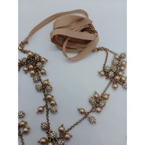Faux Pearl Rhinestone Cluster 2 Strand Silver Tone 14-54" Ribbon Chain Necklace