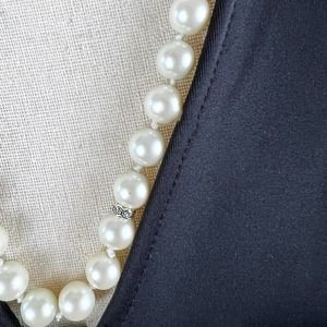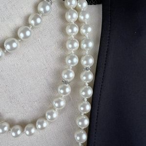 Approximately 60" total length. Pearls with rhinestone accents. Lobster clasps. Perfect condition. Never worn. High quality design and materials.