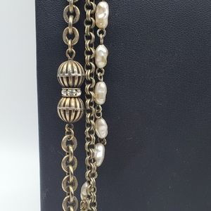 Faux Pearl Rhinestone Necklace Multi Layer Strand Antique Gold Tone Chain 48" L