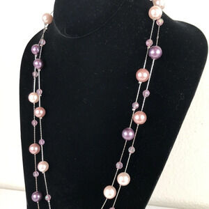 Faux Pearl Rhinestone Necklace Purple & Champagne On Silver Tone Chain