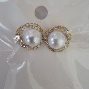 Faux Pearl Studs w Rhinestone Wrap in Gold Setting