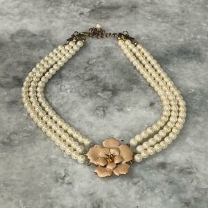 Faux Pearl Triple Strand Collar Enamel Beige Rose Fashion Necklace 14 in.