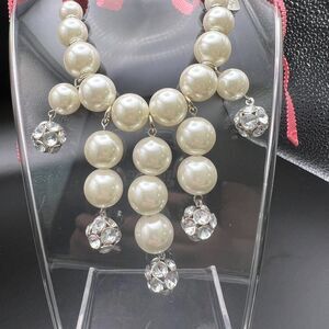 Faux pearl and rhinestone disco ball waterfall necklace with pink grosgrain ribbon closure.