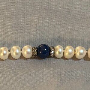 This stunning faux pearl and lapis/jewel glass necklace is 19 inches long and features a beautiful combination of classic faux pearls and vibrant lapis or jewel glass accents. Preowned but in excellent condition, this necklace adds a touch of elegance and color to any outfit. Perfect for dressing up a casual look or complementing a formal ensemble. A versatile and eye-catching piece for your jewelry collection!