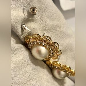 Faux Pearl rhinestone gold tone scroll pierced earrings 1” round
