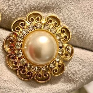1” round gold tone faux pearls pierced earrings, clear faceted rhinestones around the Pearl with outer scroll design. No marking and brand unknown. #pearljewelry #goldtonejewelry