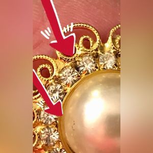 Earrings are kept in a clean smoke free home. They appear to be in good condition but zooming in closely I do see a tiny discoloration spot between a clear faceted rhinestone. None are missing but there is a dark spot. I didn’t want to jab anything in there and possibly ruin earrings but it may just need that. A careful cleaning in the tiny space next to the rhinestone. If I clean again I will update. From a distance I could not even see it. Same with the tiny mark on the side of the Pearl. I see nothing but zoom in close and there is a couple tiny marks on the same earring that has the dark spot.