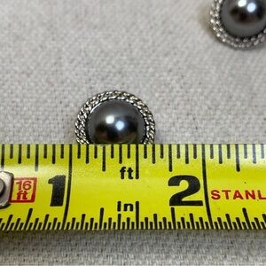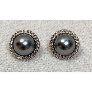 A faux grey pearl with halo of silver tone chain look setting- gently worn, no flaws- clip on style