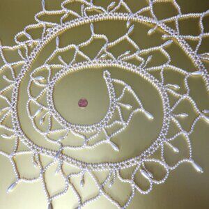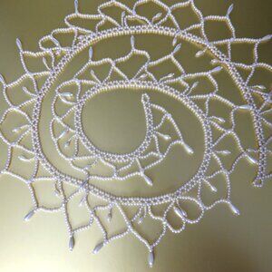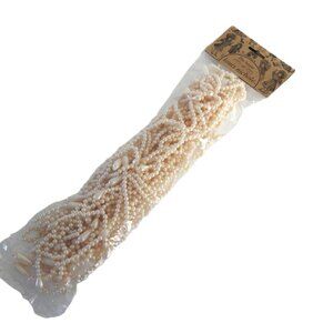 New old stock, faux pearls beaded Christmas tree garland hand-assembled into a beautiful lace. Made by The House of Louis Nichole in 1999. 6 ft long.