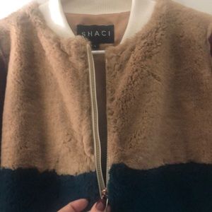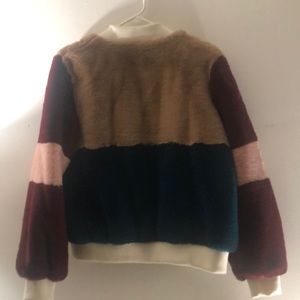 Gorgeous bomber jacket!! Worn twice and still pretty much flawless! The faux fur is incredibly Soft 🙂. The color blocks make this a piece to be seen ! 👀