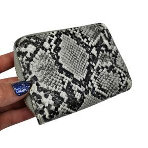 Good condition cute black white and gray colored faux snake print wallet. No rips stains or tears, one excess glue mark from when the wallet was made on the inside white area, line going across, shown in photos. Gold colored zip and hardware. No brand.