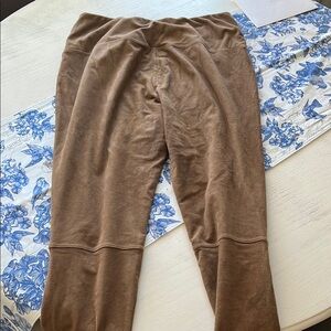 Stylish brown faux suede leggings featuring a unique lace-up detail at the ankles. Perfect for a chic and comfortable look.