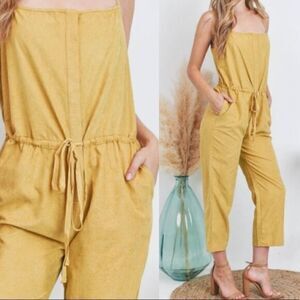 Faux Suede Drawstring Jumpsuit. Features adjustable spaghetti straps in back and drawstring at waistline with pockets.