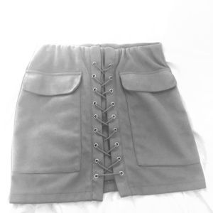 Beautiful faux suede Mini Skirt with laced detailing on front panel. Worn once or twice in great condition. Super soft faux suede material that is slightly stretchy, fist a medium size 6-8 the best. Fully functioning zipper closure on the back.