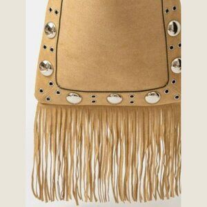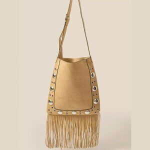This trendy tote bag features faux suede material with grommet accent detailing and fringe decoration. It's perfect for adding a touch of boho-chic style to any outfit. The spacious interior and multiple pockets make it practical for carrying your essentials.