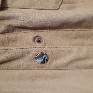 Cute faux suede jacket (lined) accentes with silver snaps. Neutral camel color makes it perfect to go with anything!
