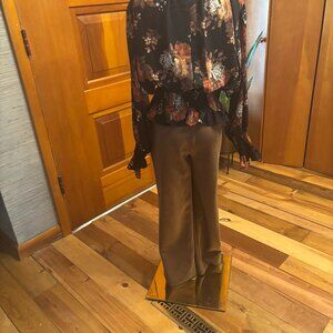 I can never get pants to look good on my mannequin but I'll do my best to describe them because they really are great pants. The fabric is like a lightweight faux suede with a bit a stretch to it so they are going to be comfortable. Designed to hit at or just below the navel. Comfortable wide waistband with angled zipper pockets on each side. Versatile color and good quality. Clean with no signs of wear. They measure 31" at the waist and the mid-rise measurement (crotch to waistband) in front is 9.5". The inseam is 26.5. The blouse is sold in another listing, it so pretty and feminine and is a size large, selling for $25. The pants are a 8 Petite.