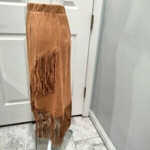 This boho-chic faux suede skirt features a faux wrap front, an elastic waistband, and a 9 inch fringe trim at the hem and front panel edge. Blending the free-spirited vibes of Bohemian fashion with rugged western flair, it is fitted, cut to follow the line of the body, and measures 34.5 inches long. It is 90% polyester and 10% spandex, machine washable and tumble dry. Pair it with flowy blouses, peasant tops, or crochet. Add earthy accessories, like turquoise jewelry, layered bangles, or wide-brimmed hats. As shown in the first picture, it looks great with ankle boots. New with tags, it is in excellent condition.