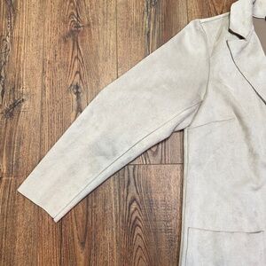 Stay stylish with our faux suede peak lapel blazer. This collared blazer features long sleeves and a peak lapel design, perfect for any occasion. With convenient patch pockets and a luxurious faux suede material, this jacket will elevate any outfit while providing comfort and functionality.
