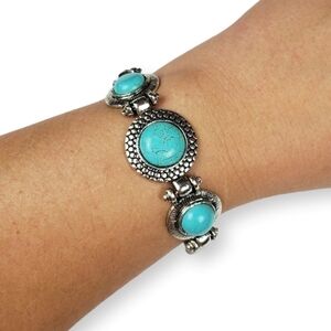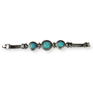 Faux Turquoise Cabochon Bracelet Snake Chain Antiqued Silved Tone Western 7"