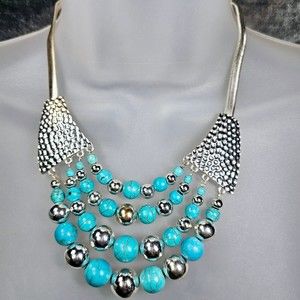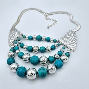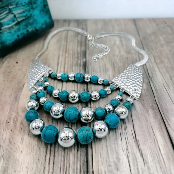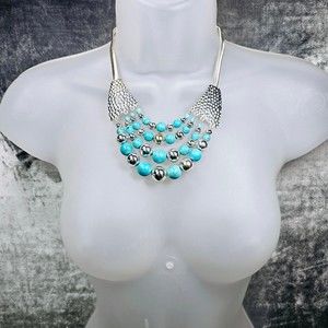 Faux Turquoise Necklace Bib Silvertone Multi Layer Beaded Statement Jewelry