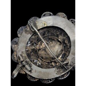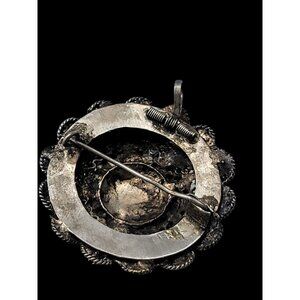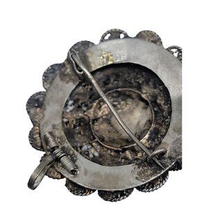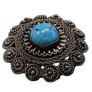 Enhance your vintage style with this striking faux turquoise brooch pendant. Silver-plated with a blue glass filigree setting, it adds elegance to any outfit. Perfect for collectors and vintage jewelry enthusiasts.
